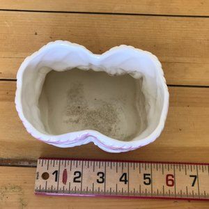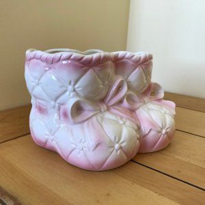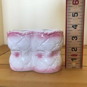 Vintage ceramic flower vase in pink & white baby booties shape. 3 1/2" tall x 5" wide x 5" thick. Vintage condition, inside has some discoloration (vase has been washed, but discoloration remains), wear to bottom of vase from display.