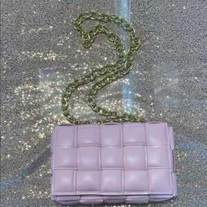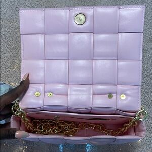 Elegant pink woven bag with a stylish chain handle. Perfect for any occasion.