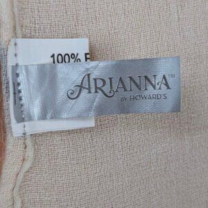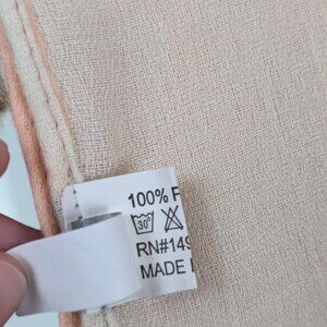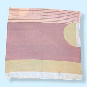 This scarf is shaped like an extra-large rectangle made of 100% polyester with machine stitched edges. The scarf also has its original tags. The pattern on the scarf is abstract, made of stripes and circles, in white, yellow, pink, and dark pink. There are wrinkles and gentle wear, but the scarf is in good condition overall.