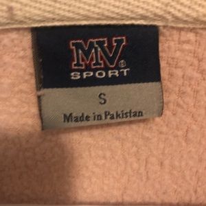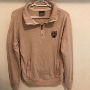 This is a light pink crew neck zip up with pockets and a UBC (University of British Columbia) logo on the front. It is very soft and in great quality.