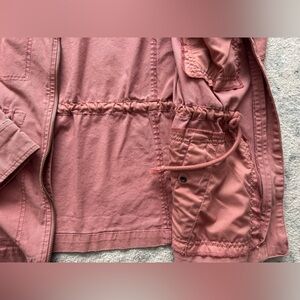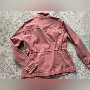 Stylish pink zip-up jacket with front pockets and button details. Drawstring waist on inside. Perfect for spring wear!