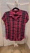 Stylish pink and black plaid button-up shirt. Features short sleeves and a classic collar.