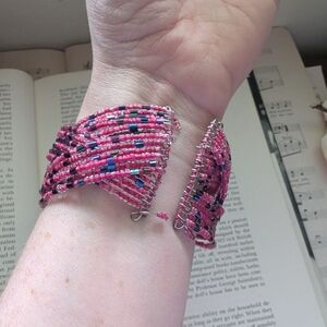 This bracelet features a stunning combination of pink and blue beads, intricately woven into a multi-strand design. The braided pattern creates a wide, cuff-like appearance, making it a standout piece for any casual or bohemian look. Its flexible structure ensures comfort and style, perfect for adding a vibrant touch to your ensemble.