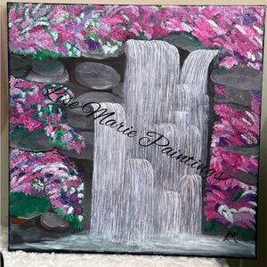 This captivating painting features a stylized waterfall in soft gray tones, surrounded by vibrant pink hues that evoke a lush, floral landscape. The interplay of colors and textures creates a dynamic and serene composition, perfect for adding a touch of elegance to any space.