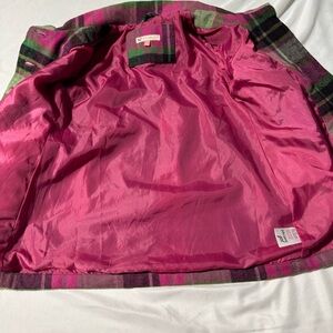 This stylish pea coat features a vibrant plaid design in pink and green, perfect for colder weather. Made from a thick warm wool blend material, it includes a folded collar and long sleeves for added comfort and style. Adding to the elegant look, this jacket showcases bubble sleeves.