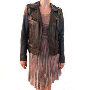 I think this dress would fit someone who wears S/XS and is 5'6" or shorter. I intended to style it as shown with a leather jacket but it's just way too short and a bit tight for me (5'8") and returning was a pain.
