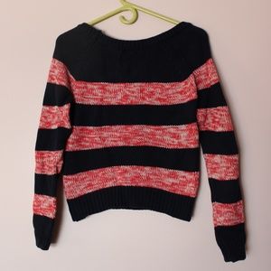 A cute and cozy knit sweater by American Eagle. Has a pink and navy knit design. Has a slight crop.