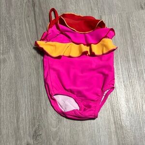 Vibrant pink swimsuit with orange ruffle details. Perfect for a fun day at the pool.