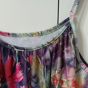 This sleeveless camisole features a vibrant floral print in shades of pink and red, set against a darker background. The relaxed fit and light, flowing fabric make it perfect for warm weather. Its artistic, watercolor-like design adds a touch of elegance to any casual outfit.