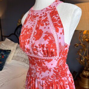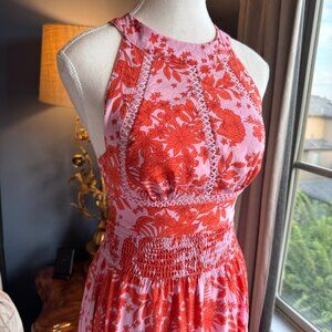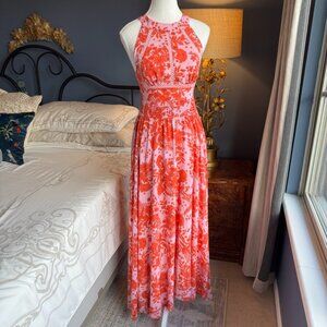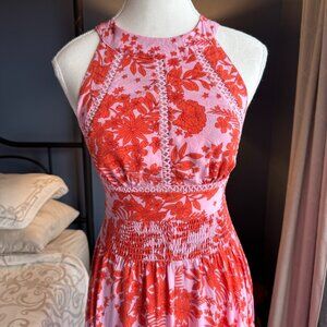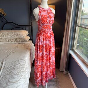 Pink and red tropical floral print maxi dress, size S by Abel the Label. Halter neck, open tie back, ruched waistband, slit at front side. Great used condition. 100% rayon. Bust difficult to measure but easily fits 34-36 B/C, waist measures 11.75 inches laying flat, can easily stretch to 15 inches, length of dress is 49 inches at front, about 51 at back. Cat friendly, nonsmoking home.