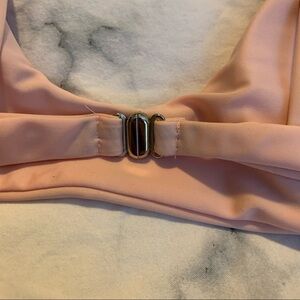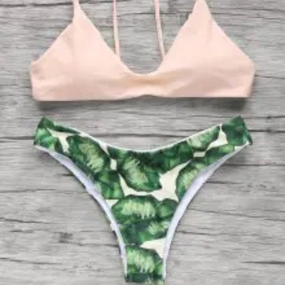 Brand new without tags, never worn! This bikini comes as a set and features a light pink top with a white and tropical leaf print bottom, both in size medium. The bottom is double lined so that it is not see through, and is a cheeky style. The top has spaghetti straps and removable padding, with a silver coloured closure.