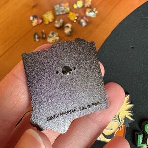 This charming jewelry pin showcases a vibrant pink background with a captivating anime character illustration. Adorned with delicate white flower embellishments, it adds a playful touch to any ensemble.
