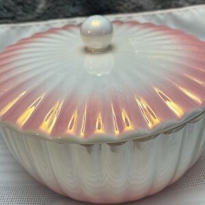 Elegant ceramic bowl with a pink and white gradient. Features a decorative lid and handles. No chips or cracks. Excellent condition
