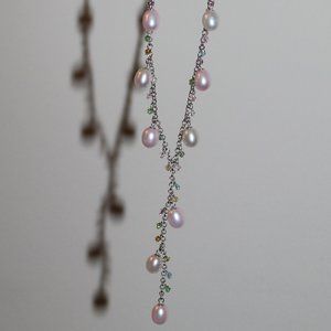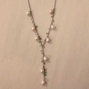 Fairy godmother? Mermaid princess? Whatever your aesthetic, complete your ensemble with a bit of soft shimmer when you wear this silver cable-chain necklace featuring pink and white freshwater pearls set off with colourful transparent beads. The last three pearls form a dangling stem for this Y-shape necklace.