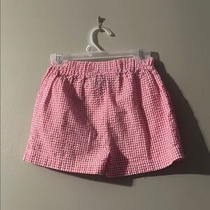 These shorts showcase a delightful pink gingham pattern, ideal for a casual summer vibe. The elastic waistband provides a comfortable fit, and the textured fabric adds a classic touch. Perfect for relaxed outings, these shorts combine style and ease effortlessly.