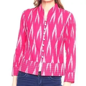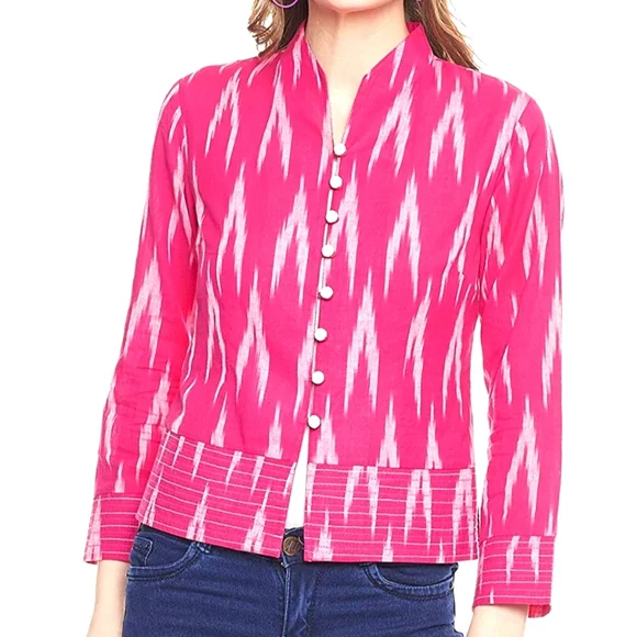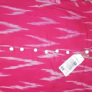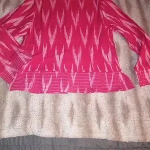 Pink blazer with white detailing, this is so beautiful with white gum drop buttons and slits in the bottom sides, well made. Size xlarge but fits more like a medium