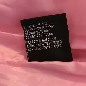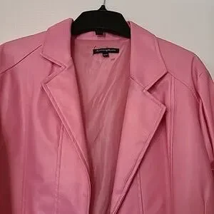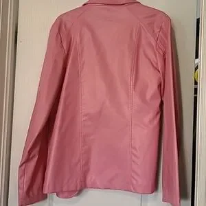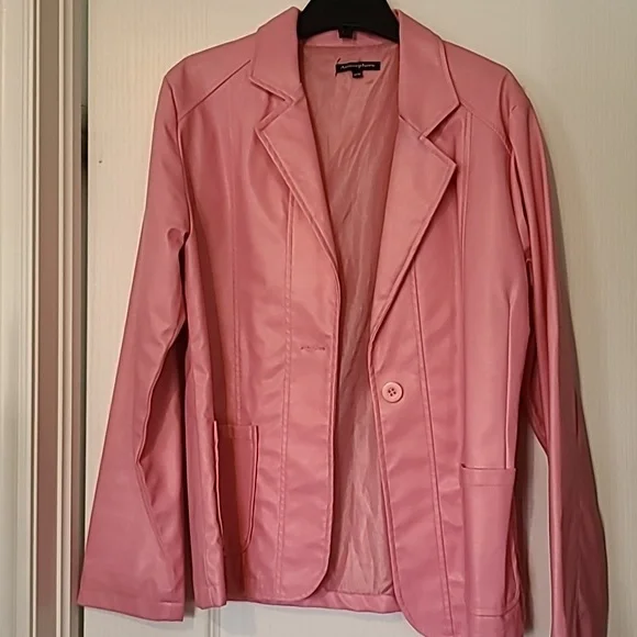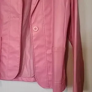 Pink blazer with one button. Polyurethane fabric and includes lining. There are 2 front pockets. Size Medium.