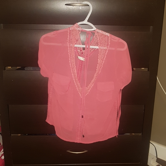 Lace and see through pink tee sleeve blouse with buttons and pockets