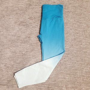 The ombre effect on both the top and leggings is beautiful and the fabric is stretchy and comfortable. Great for any type of work out, or for just hanging out! Both the top and bottom has lots of stretch and can fit up or down a size.