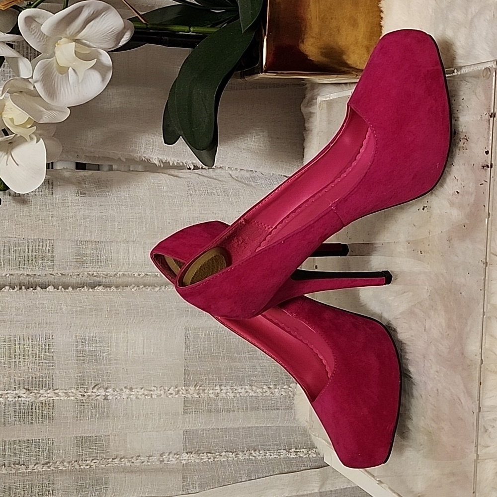 faux suede magenta pink heels. EUC. has heel protection. used once for a 4 hour event. mostly sitting. size 8.5 the protection on heels make them fit 8-8.5