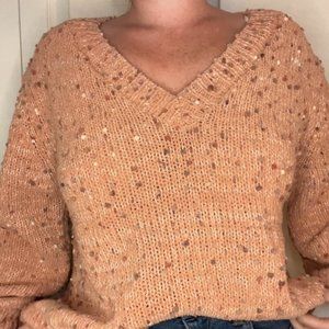 Pink V-kneck sweater with multicoloured knit detail that resembles confetti.