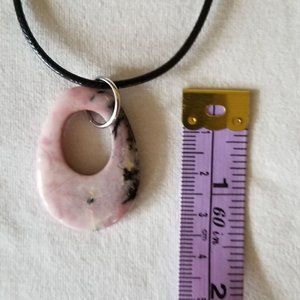 Rhodonite gemstone, natural pendant, pink and black, on a black cord, length ~17.75 inches. Natural oval donut stone is ~3.2 cm long, natural black veining in the stone, hand made, hand crafted, artisan pendant jewelry/jewellery, unisex.