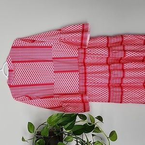New without tags, v neckline with mandarin collar, 3/4 bell sleeves, drop waist with tiered design, light fabric, unlined, light and dark pink