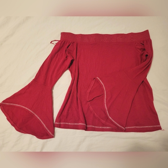 pink top, off shoulder, asymmetrical sleeves