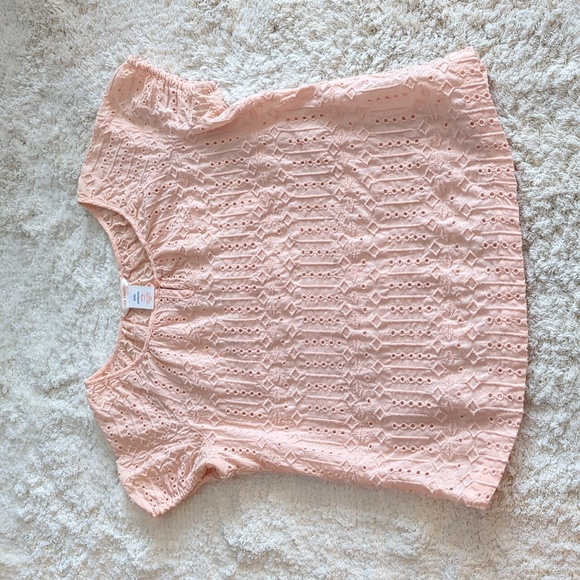 peachy/pink. short sleeve. textured. kids but can fit petite sizes