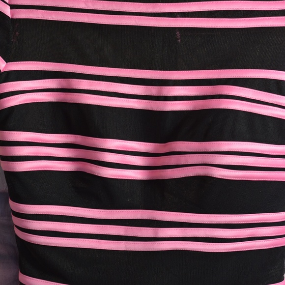 This top is so pretty and well made. The stripes are a satiny ribbon sewn on a netting which is lined throughout the body of it. Shoulders and short sleeves are not lined. Very sexy. Zippered back. SZ 4 by JS Collections