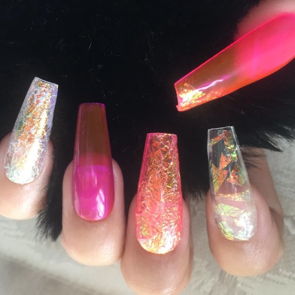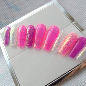 Pink/Purple Jelly n Iridescence foil press on nails Can be used with sticky pads for short time wear. Or glue on for up to two week hold . For best results,