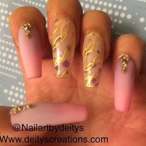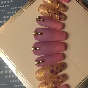 Pink/Purple with Nude and Gold detail press on nails Can be used with sticky pads for short time wear. Or glue on for up to two week hold . For best results,