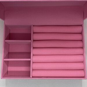 Very cute pink jewelry box. On the top of the jewelry box is a quote “There Are Far Better Things Ahead Than Anything We Leave Behind”. Plenty of room to store all your pretty jewels! *manufacture defects*