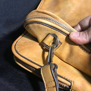 This stylish crossbody bag features a sleek tan finish and an adjustable strap, ideal for carrying essential items daily. Its faux leather material adds a touch of sophistication to any outfit.