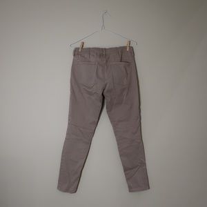 Pinkish beige cargo pants with knee-patch and industrial zipper detailing. Lightly worn. Waist was taken in originally, so marks are still slightly visible where stitches were.