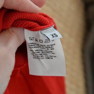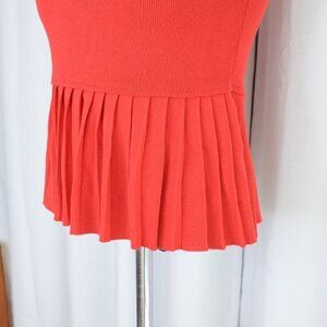 Gorgeous bright cherry tomato red knit top by Italian designer, Pinko. Features cap sleeves and a pleated peplum style bottom.