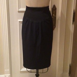 High waisted pencil skirt with wide elastic waist band and metal exposed front buttons