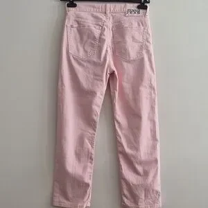 Pink straight leg jeans with a gold logo button and rivets. It has a name plate on the back of the waistband and the right back pocket is stitched with a P&J. Italian Boutique brand. Waist measures 14.5" and stretches, rise is 10.5" and inseam is 25". Gently worn.