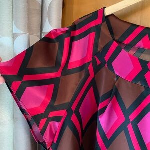 Vibrant. Size 18W. a striking graphic design in vibrant pinks, black, brown featuring a modern diamond pattern. The short sleeves and soft fabric make it perfect for casual wear, offering both comfort and style.