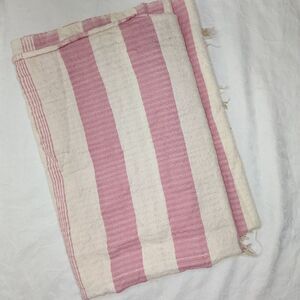 Pink & creamy white striped cotton linen knit blanket scarf with knotted fringe.