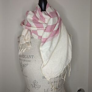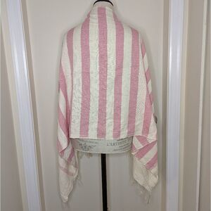 Pink & creamy white striped cotton linen knit blanket scarf with knotted fringe.