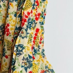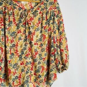 Lovely BoHo style floral blouse features scoop neck with tie, gathered along bodice on front and back. and pleated puff sleeves.