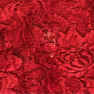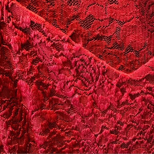 This beautiful crimson dress features all over lace detailing, a sweetheart neckline, and a flattering cut. There is some yellowing of the lace, as shown - otherwise in great condition. Measurements in photos.