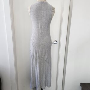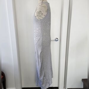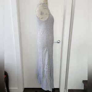 Black & White Contrast Pinstripe stretch Sleeveless Crewneck Maxi Dress with highlow hem and asymmetrical seams, by LA based clothing company LOVE BASIC.