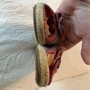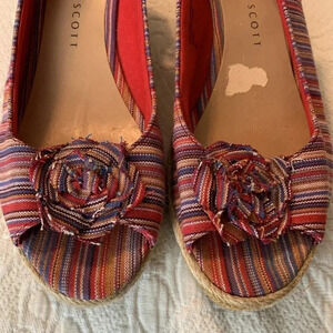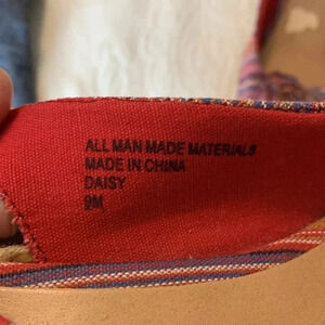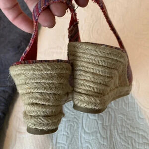 Gorgeous shoes! Red/blue/yellow/white pinstripes pattern fabric. Open toe. Wedge heel. Elastic band at heels. Gently worn. Sticker ripped spot off. Size 9.