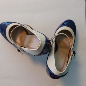 A pair of 50s style pin-up girl pumps in navy and cream. I bought these for a photoshoot that never happened. They've never been worn. They're very cute. They'd be perfect for a costume party or a summer garden party.