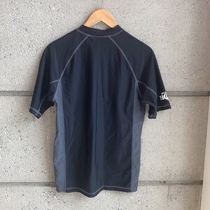Mens rashguard previously worn by my hubby . We were on a vacation and got invited out to surf but our luggage had been lost so he had to buy this overpriced one a hotel boutique so we could go out. Still in good condition and ready for someone that will wear it. Lots of stretch to it but here are the lay flat measurements…