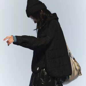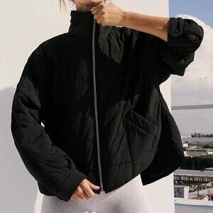 Introducing: our first-ever performance puffer, featured in a packable design that folds into its own pocket creating a comfy travel pillow—ideal for planes, trains and more. color is Black. Size M. Fabulous jacket!