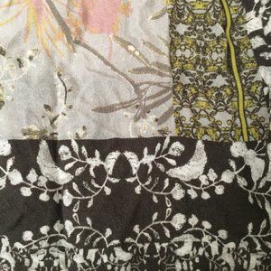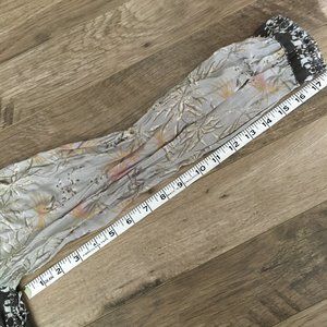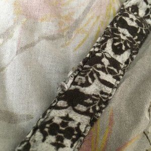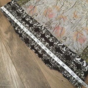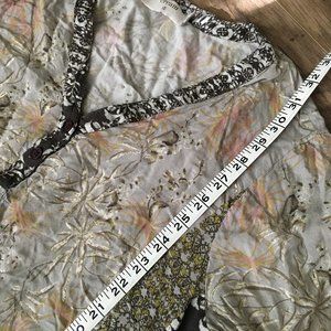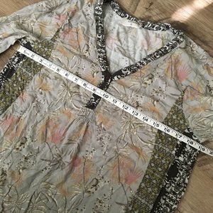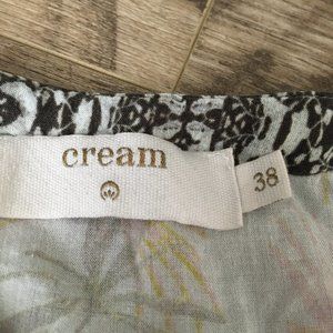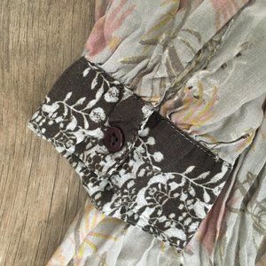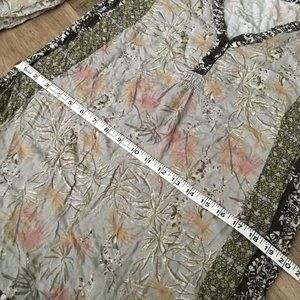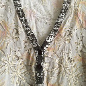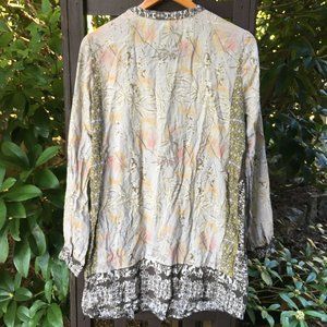 Good preowned condition 'Pippa' tunic by Cream featuring a subdued motif of tasteful flowers in browns, peach tones, olives against a grey background accompanied by a dark, almost olive green decorative trim. Beautiful piece. There is a little bit of fray on one of the trims (please see photo). Wrinkly in the photos, but I always wash and hang dry items prior to shipment.