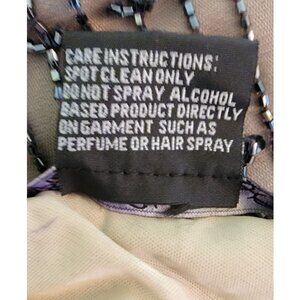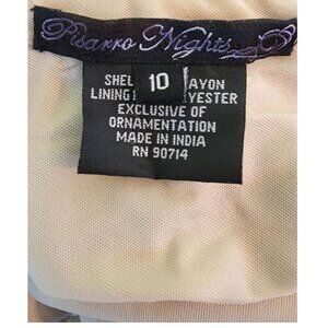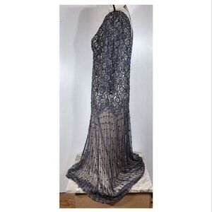 This stunning vintage-inspired Pisarro Nights evening gown is perfect for a formal event, wedding, or gala. The dress features a beautifully intricate beaded overlay with a floral pattern on the bodice and sleeves, and a vertical beaded pattern on the skirt. The sheer overlay creates an elegant illusion effect.
